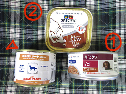 ということで、獣医さんに相談したところ、三種類の療治食を用意してくれました。