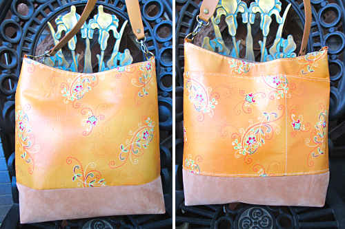 コーティング生地で、素敵な色合いです。夏向けですね。切り替えにスエードを使用しています。
